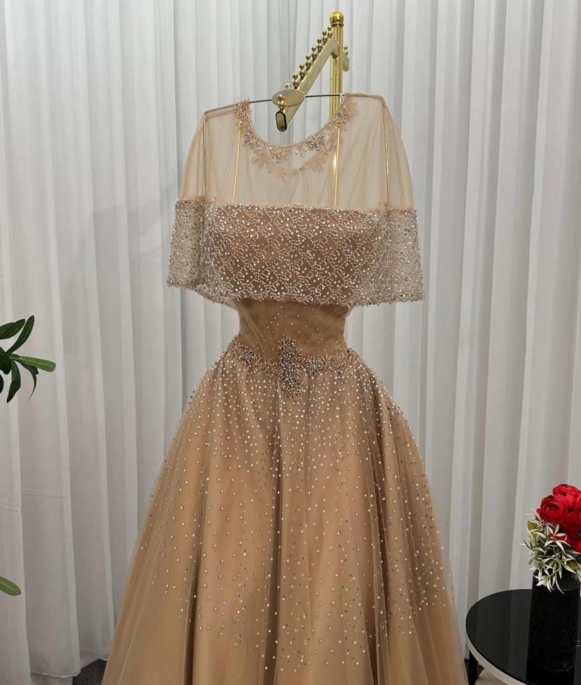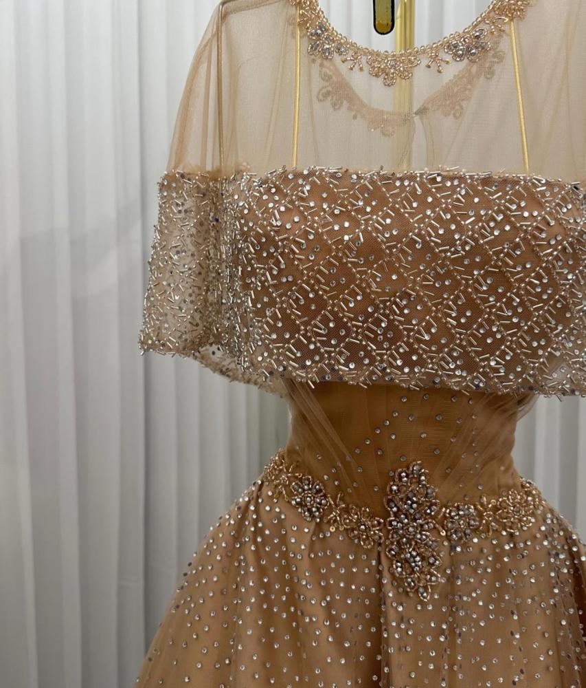 • اللون: شامبين دافئ يضفي إشراقاً على البشرة ويمنح الفستان طابعاً ملكياً.