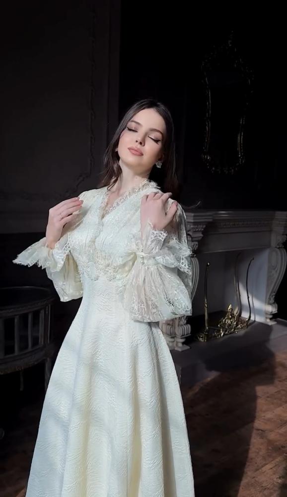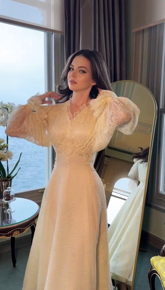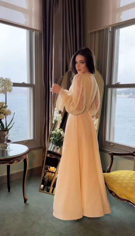 • القصة: فستان طويل بقصة حورية البحر (ميرميد) بتصميم كلاسيكي ومحتشم مع أكمام طويلة وخط رقبة على شكل حرف V. يتميز بثنيات على الصدر وشال متصل في الخلف لإضفاء لمسة دراماتيكية.