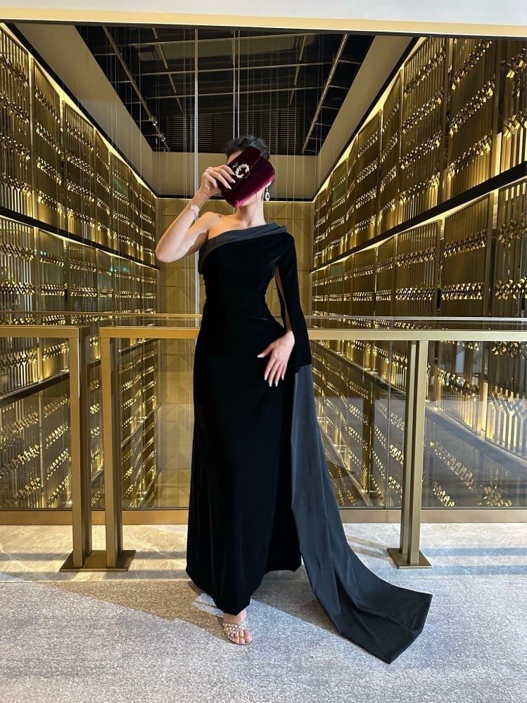 • تصميم بكتف واحد مكشوف يبرز الأناقة والأنوثة، مع تفاصيل ناعمة تنساب بشكل أنيق.