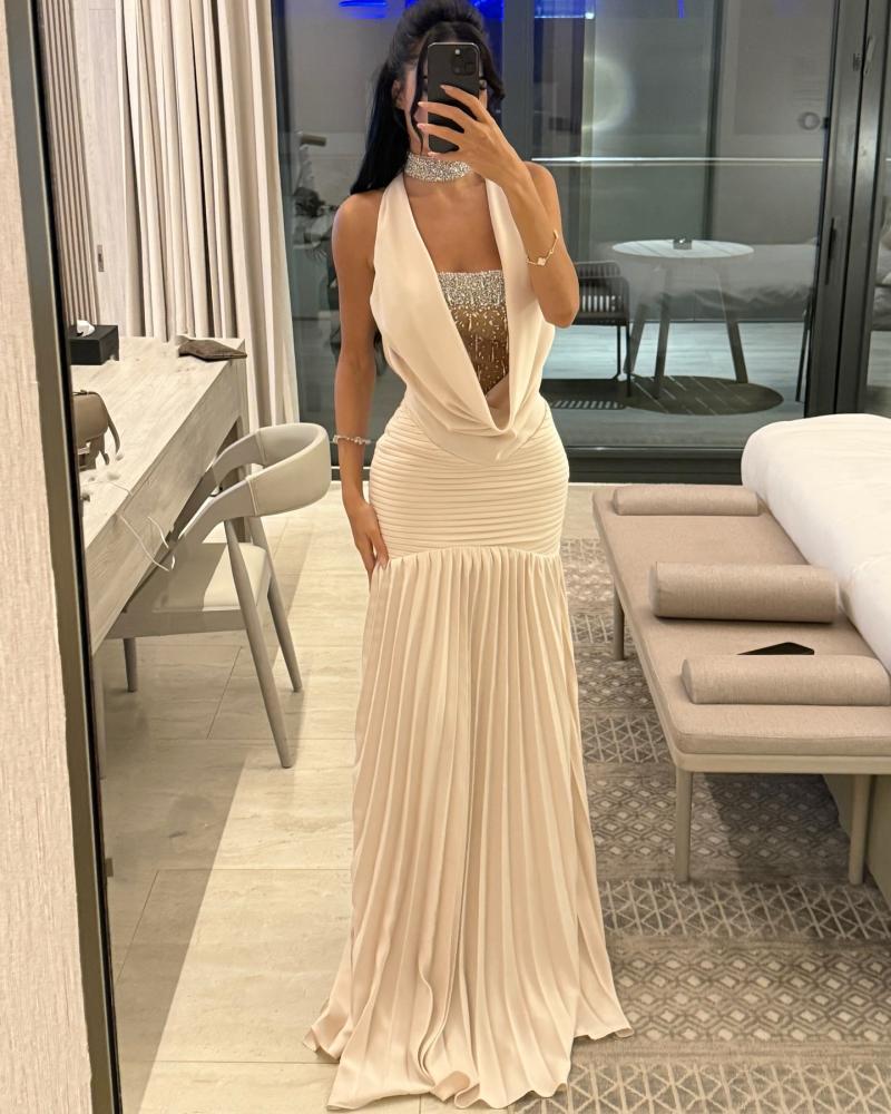 فستان بلون بيج فاتح بأكتاف عارية وفتحة صدر عميقة، مع تنورة ذات طيات (كسرات).