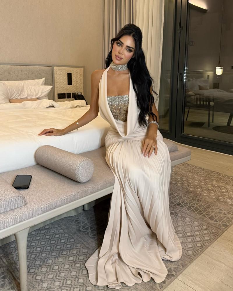 * اللون: بيج فاتح (اوف وايت)، وهو لون كلاسيكي وهادئ يضفي أناقة على الإطلالة، مع لمسة من البريق الذهبي عند منطقة الصدر.