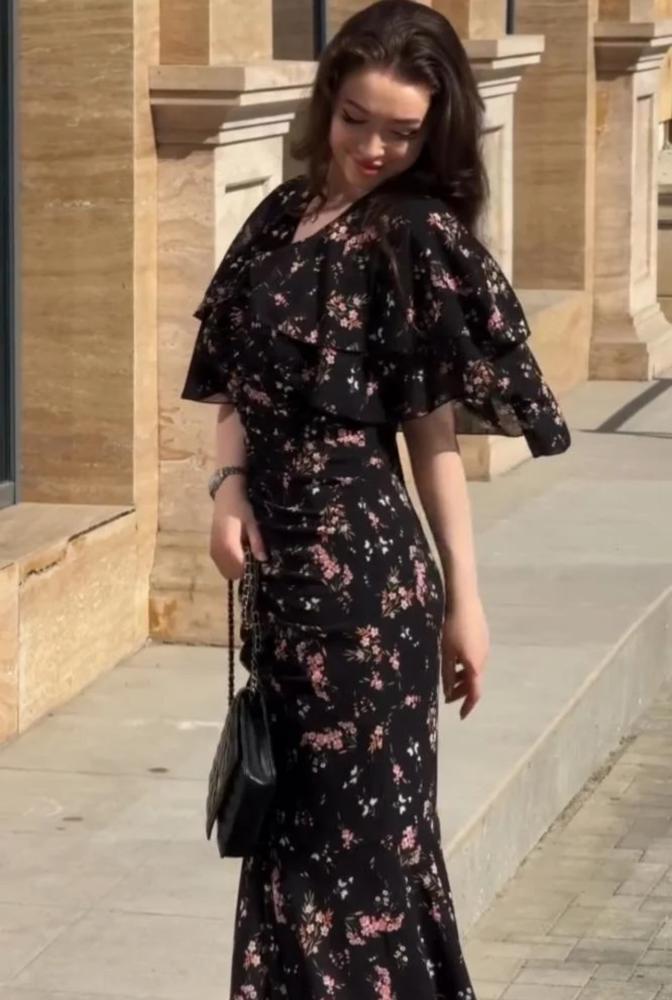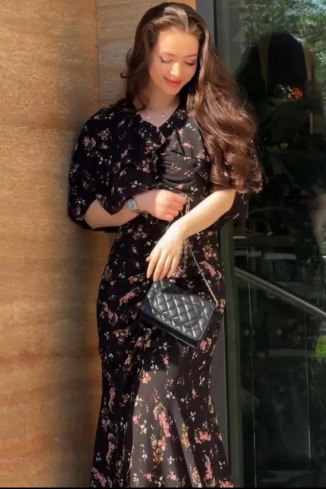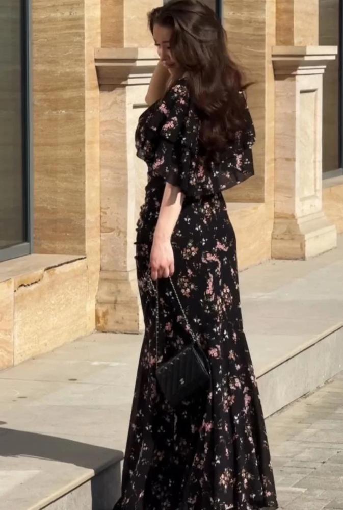 إطلالة يومية أنيقة بنفحة رومانسية حالمة، يتألق فيها الفستان الأسود المزين بطبعات زهرية دقيقة تمنح إحساسًا بالنعومة والأنوثة. تصميم الفستان يجمع بين الانسيابية والبساطة، مع لمسة كلاسيكية مريحة تناسب أجواء النهار والمناسبات الهادئة. الخصر محدد برقة ليبرز القوام، أما الأكمام فبقصّة فضفاضة تضيف حيوية وأناقة ناعمة.