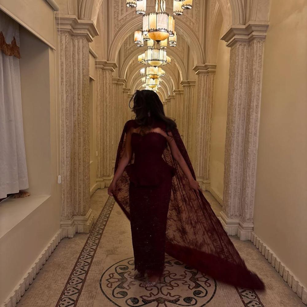 القصة: فستان بقصة عمودية ضيقة (Sheath) تصل إلى الأرض. يتميز الجزء العلوي بكونه بدون حمالات (Strapless) مع تصميم بيبلوم (Peplum) خفيف عند الخصر. أهم ما يميز التصميم هو الكاب الطويل (Cape) المرفق، المصنوع من الدانتيل الشفاف، والذي ينسدل من الأكتاف ليغطي الجزء الخلفي بطول الفستان، مما يمنح إطلالة ملكية ودرامية.