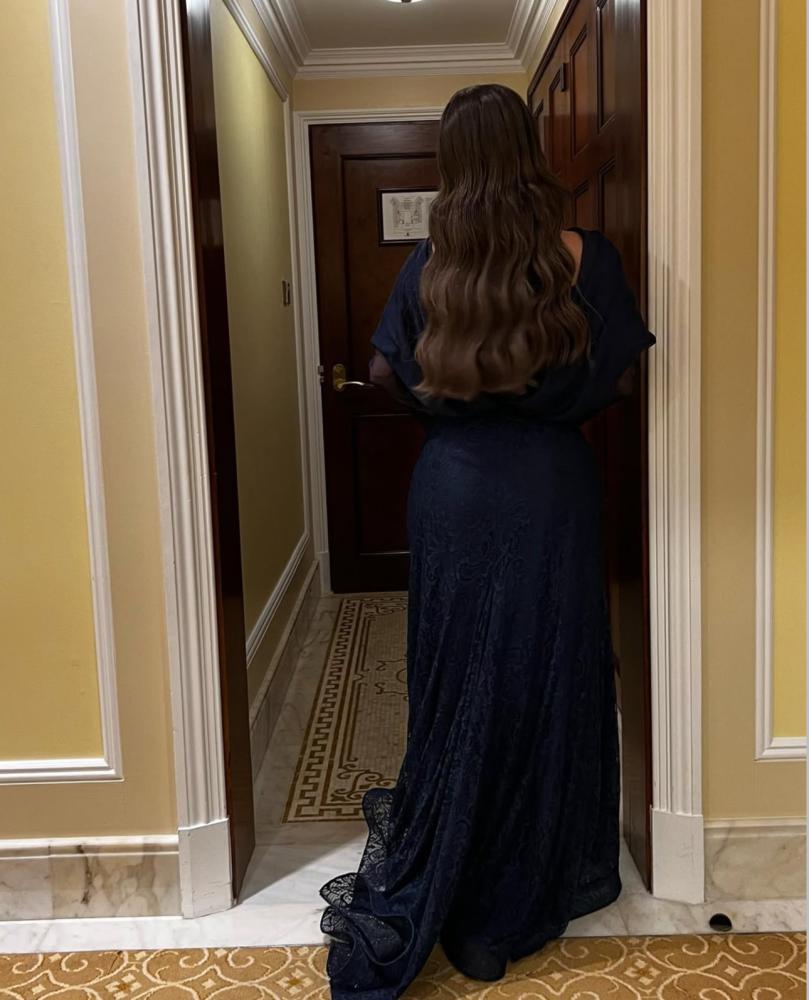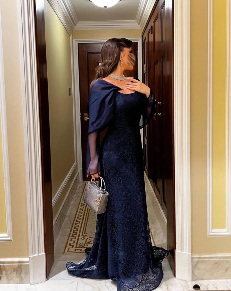 • التفاصيل: الجزء العلوي من الفستان يتميز بقصة صدر واسعة، مع طبقة علوية من القماش الشفاف المنسدل على الأكتاف. الجزء السفلي من الفستان مزين بتفاصيل من الدانتيل أو التطريزات، مما يضفي عليه مظهراً فخماً.