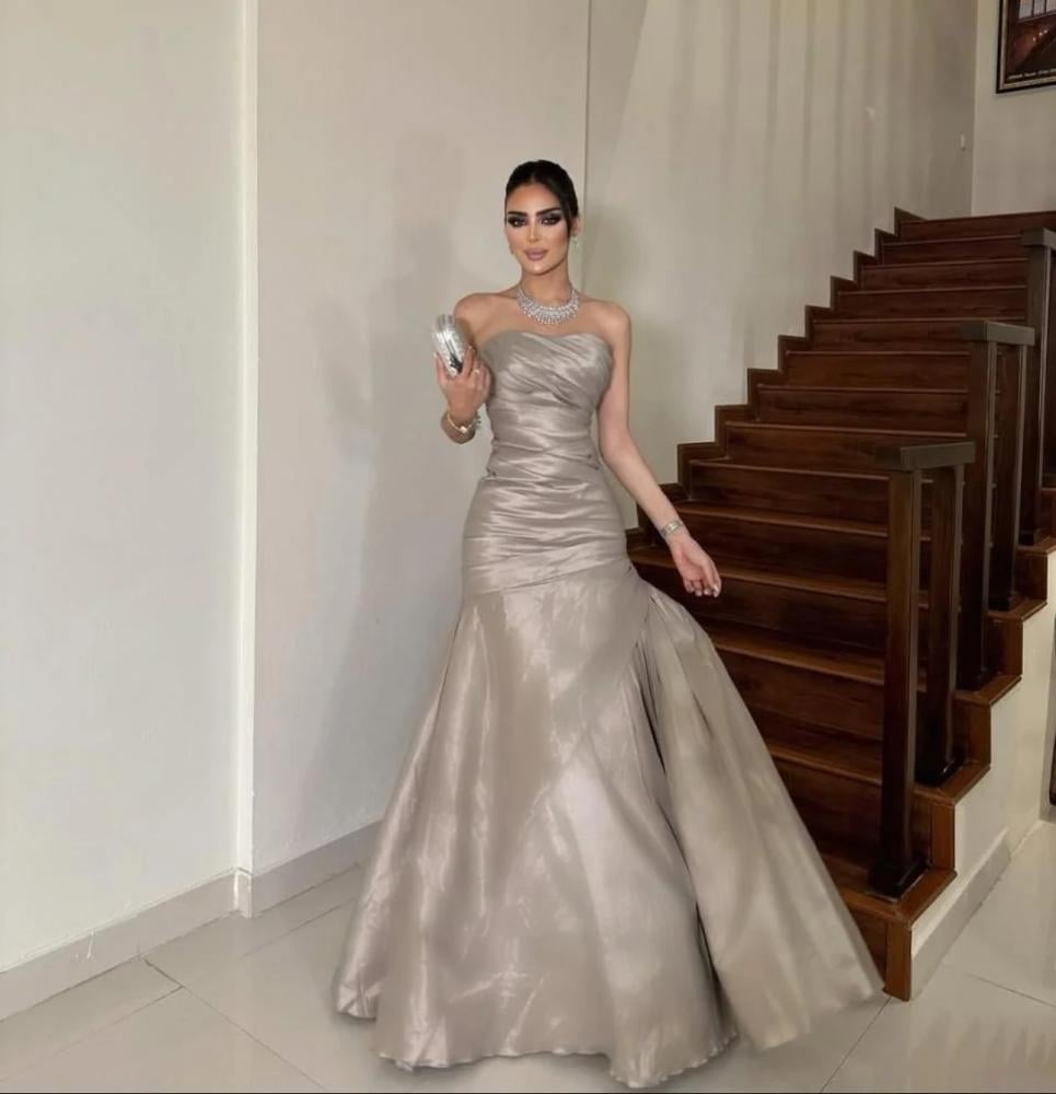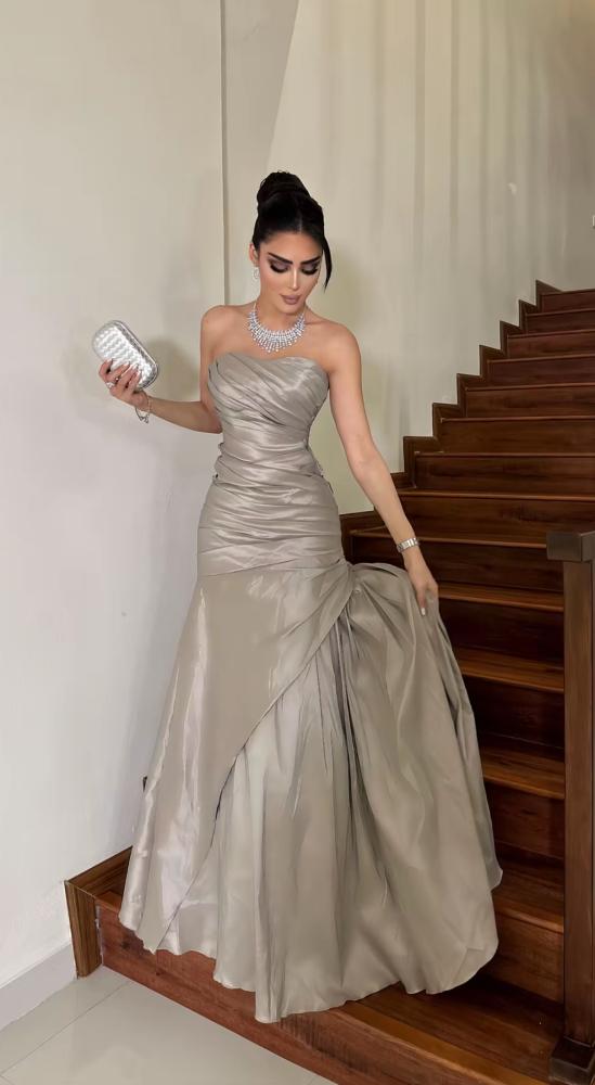 فستان سهرة طويل وأنيق، مصنوع من قماش ساتان لامع بلون فضي رمادي جذاب. يتميز بتصميم حورية البحر (Mermaid Cut) الذي يبرز جمال الجسم، مع قصة ضيقة على الخصر وأكتاف مكشوفة بقصة على شكل قلب. يُضفي لمعان القماش لمسة من الفخامة، ويكتمل المظهر بحقيبة صغيرة وإكسسوارات أنيقة، مما يجعله خيارًا مثاليًا للمناسبات الرسمية والاحتفالات