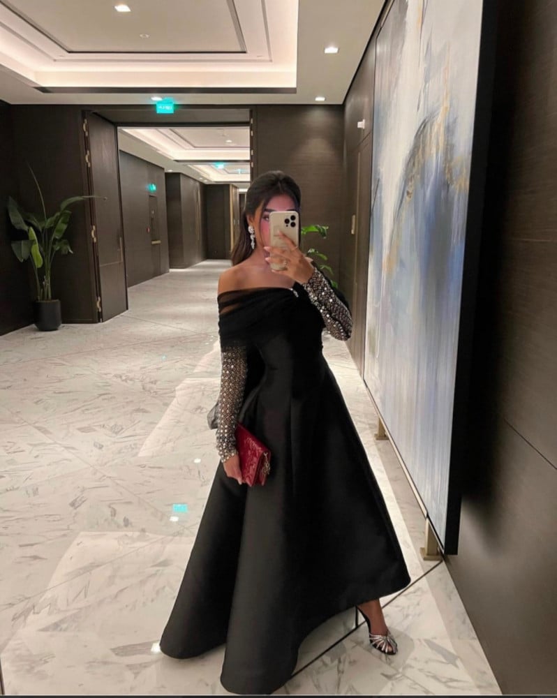 الأكمام المطرزة: تعتبر الأكمام المطرزة من أبرز ملامح الفستان. تأتي الأكمام طويلة أو نصف طويلة، وقد تكون مصممة من قماش شفاف أو مشغولة بتطريزات غنية ورفيعة باستخدام خيوط لامعة أو خرزات دقيقة. هذه الأكمام تضفي على الفستان لمسة من الجاذبية وتزيد من فخامته، مع تأثير بصري رائع عند الحركة، حيث يعكس التطريز الضوء بشكل أنيق. يمكن أن تكون الأكمام مطرزة بالكامل أو فقط على الأطراف أو الأكتاف، ما يضيف بعدًا من التفرد والرفاهية.