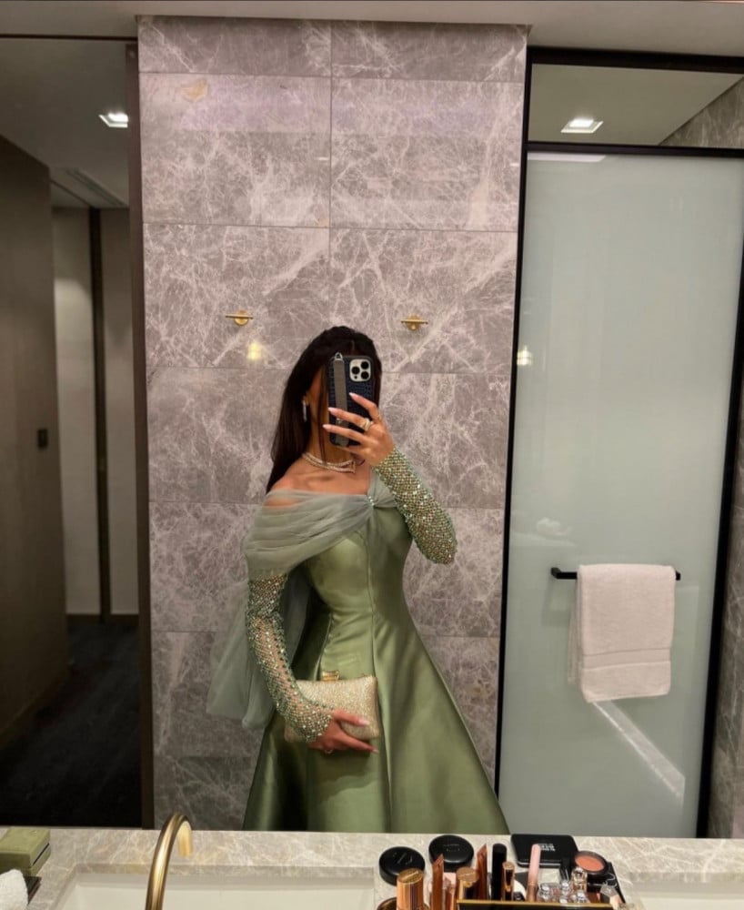 التنسيق: يمكنك تنسيق هذا الفستان مع حذاء كعب عالي أنيق، سواء كان بلون محايد أو متناسق مع اللون الأخضر في الفستان. الإكسسوارات مثل الأقراط الكبيرة أو سوار لامع ستكمل الإطلالة الفاخرة. لا تنسي اختيار حقيبة صغيرة (كليتش) تتناسب مع الفستان، والتي يمكن أن تكون باللون الذهبي أو الفضي لإضافة لمسة من التألق.