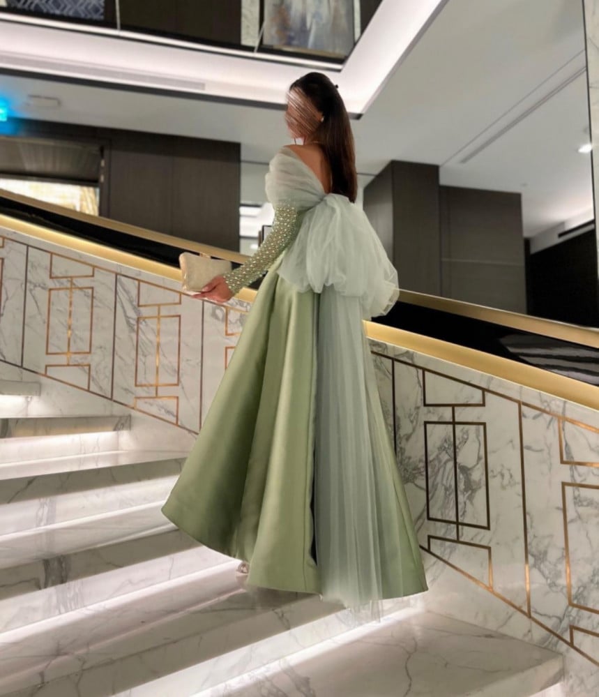 الخامة والتفاصيل: الفستان مصنوع من خامات فاخرة مثل الساتان أو الشيفون أو التول، ما يجعل الإطلالة ناعمة وأنيقة في نفس الوقت. هذه الخامات تتناسب مع التصميم الفخم للفستان وتضفي عليه لمسة من اللمعان والنعومة. يمكن أن يكون الفستان ذا خط رقبة مستدير أو V، مما يعزز من الإطلالة الأنثوية الجذابة. أما الطول، فيتراوح بين المتوسط والطويل، مع تنسيق ينساب برشاقة على الجسم ويصل إلى الكاحل أو أسفله بقليل، ليكمل المظهر الرفيع.