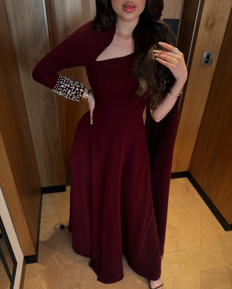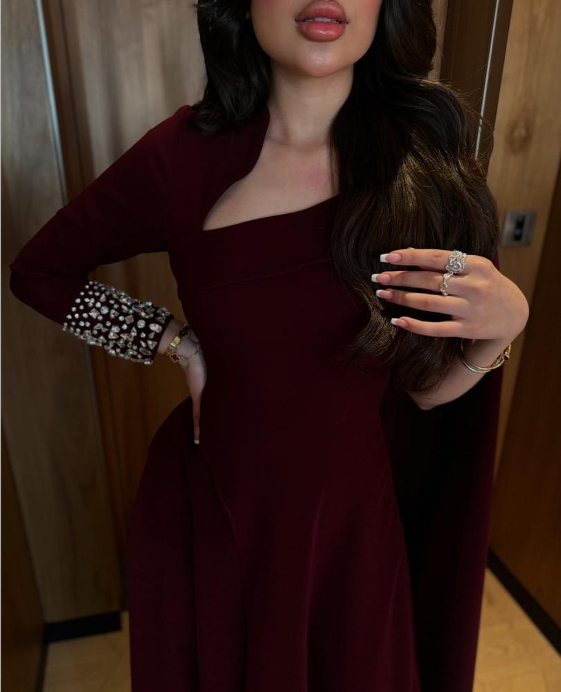 الفستان يتميز بتصميم أنيق يجمع بين الرقي والبساطة، مصنوع من قماش انسيابي بلون عنابي فاخر. يتميز بقصة طويلة ومثالية تعزز جمال القوام، مع أكمام طويلة بلمسة فريدة تضفي طابعاً ملكياً. تصميمه مناسب للمناسبات الخاصة مثل حفلات التخرج أو السهرات الراقية، حيث يمنحك إطلالة تخطف الأنظار